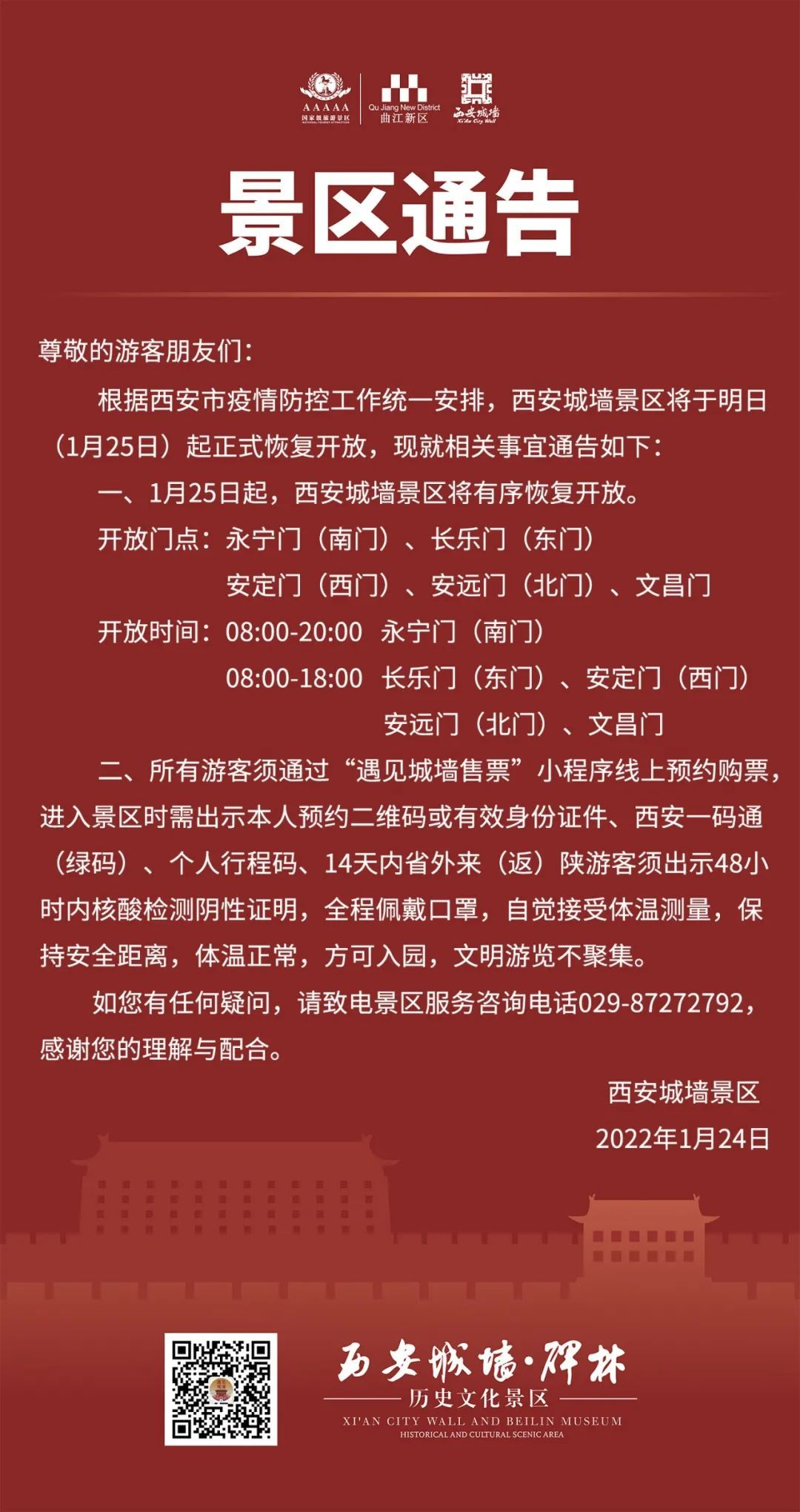 根據(jù)西安市疫情防控工作統(tǒng)一安排,西安城墻景區(qū)將于明日(1月25日)起正式恢復(fù)開放,現(xiàn)就相關(guān)事宜通告如下: