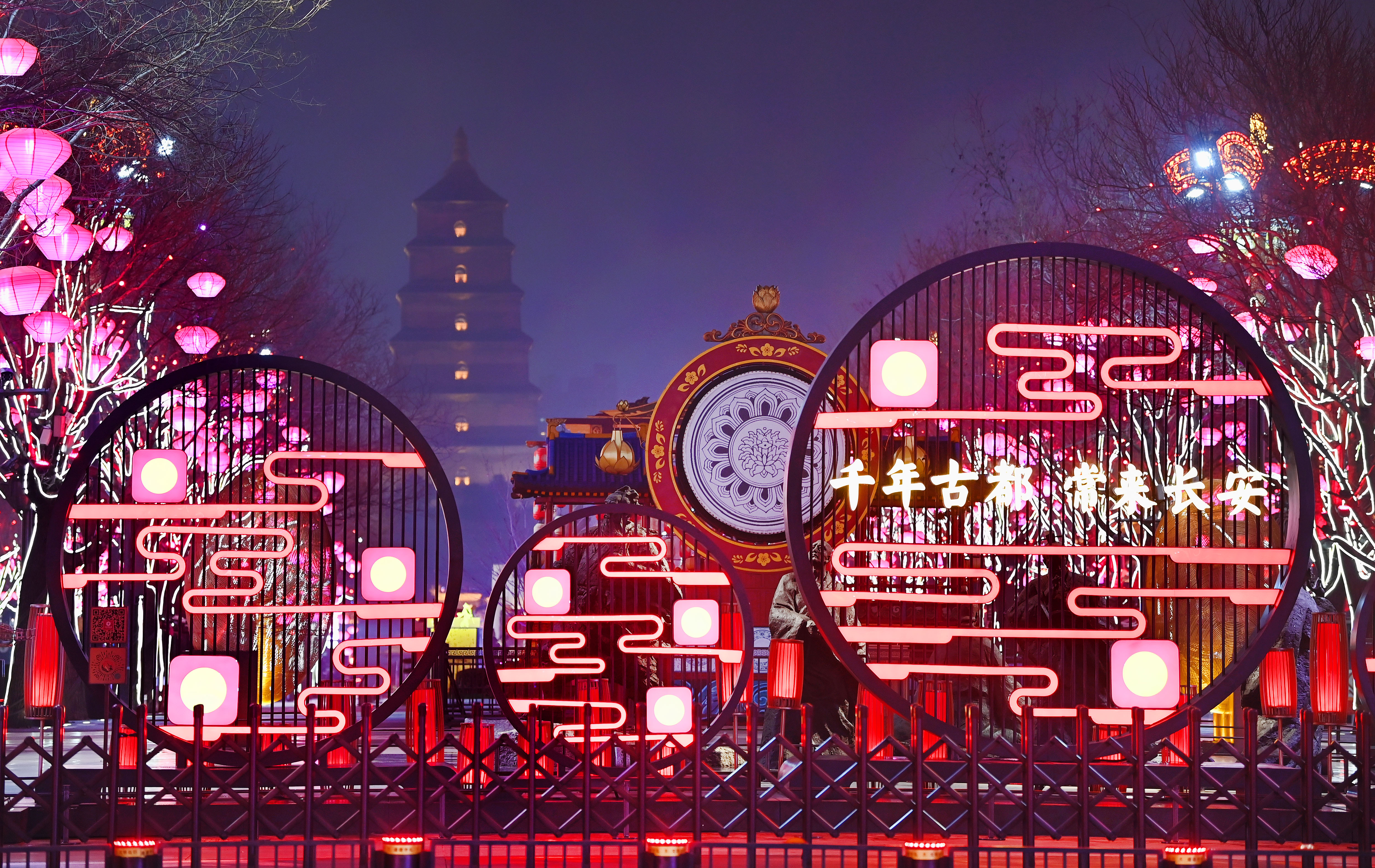 西安市大唐不夜城點(diǎn)亮璀璨奪目的燈光,迎接新春佳節(jié)的到來(lái)。新華社記者 陶明 攝