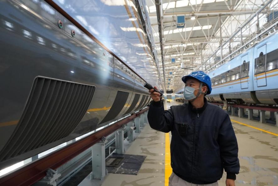 1月29日,在中國(guó)鐵路西安局集團(tuán)公司西安動(dòng)車段檢修庫(kù)內(nèi),質(zhì)檢車間質(zhì)檢三組質(zhì)檢員龔奇正檢查著動(dòng)車組走行部位,手中的可錄式手電一一掃過(guò)車輪、齒輪箱、閘片等配件,眼隨手動(dòng),緊盯著手電光照的地方,時(shí)不時(shí)伸手確認(rèn)配件安裝狀態(tài)。