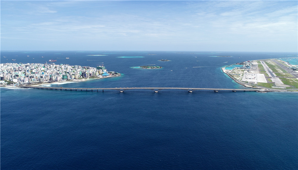 這是2019年8月30日在馬爾代夫航拍的連接首都馬累和機(jī)場島的中馬友誼大橋。新華社發(fā)(王明亮攝)