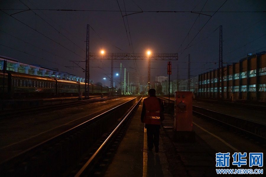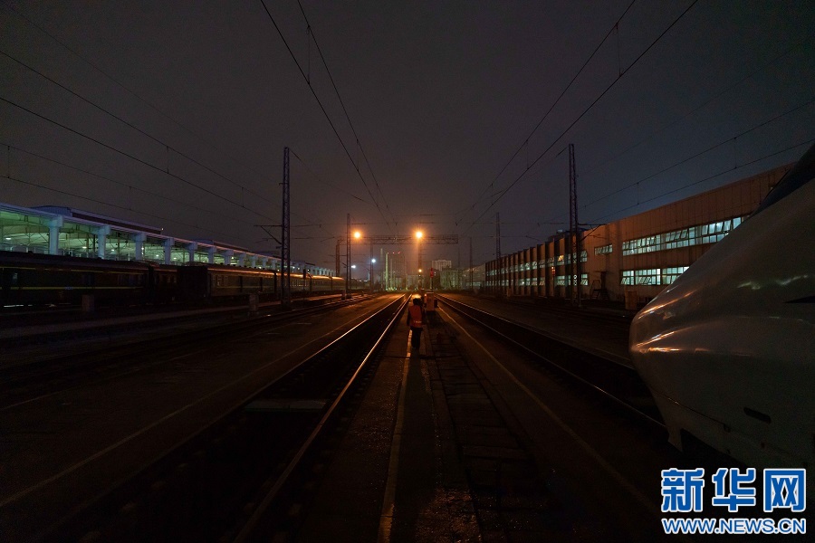 檢查完動(dòng)車組,蘇盛行走在列車停車場(chǎng)內(nèi)。新華網(wǎng)發(fā) 趙磊 攝
