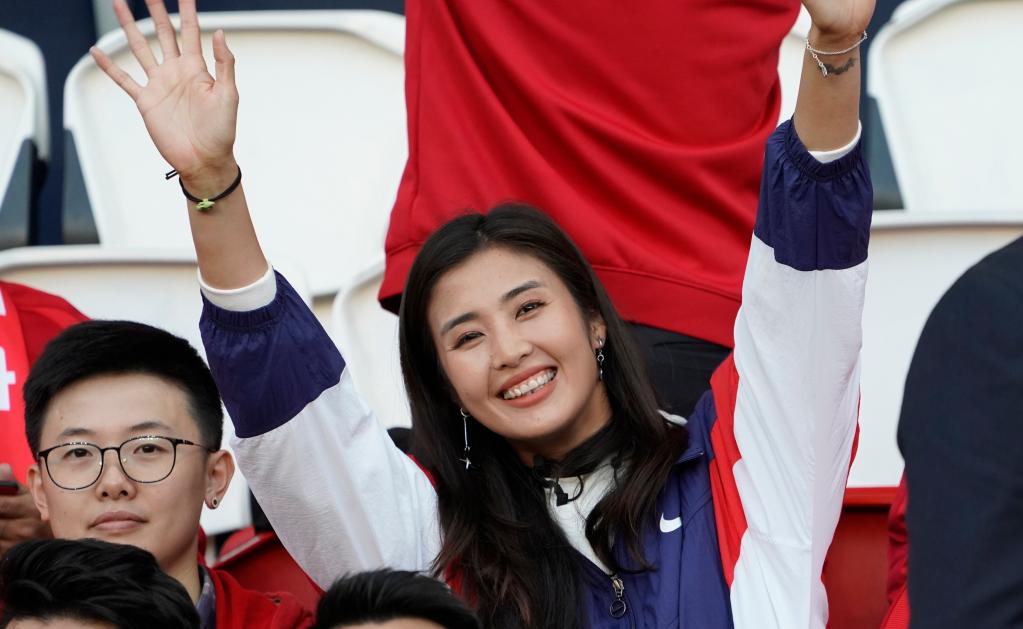 2019年6月13日,中國女足守門員趙麗娜在看臺上加油助威。新華社記者丁旭攝