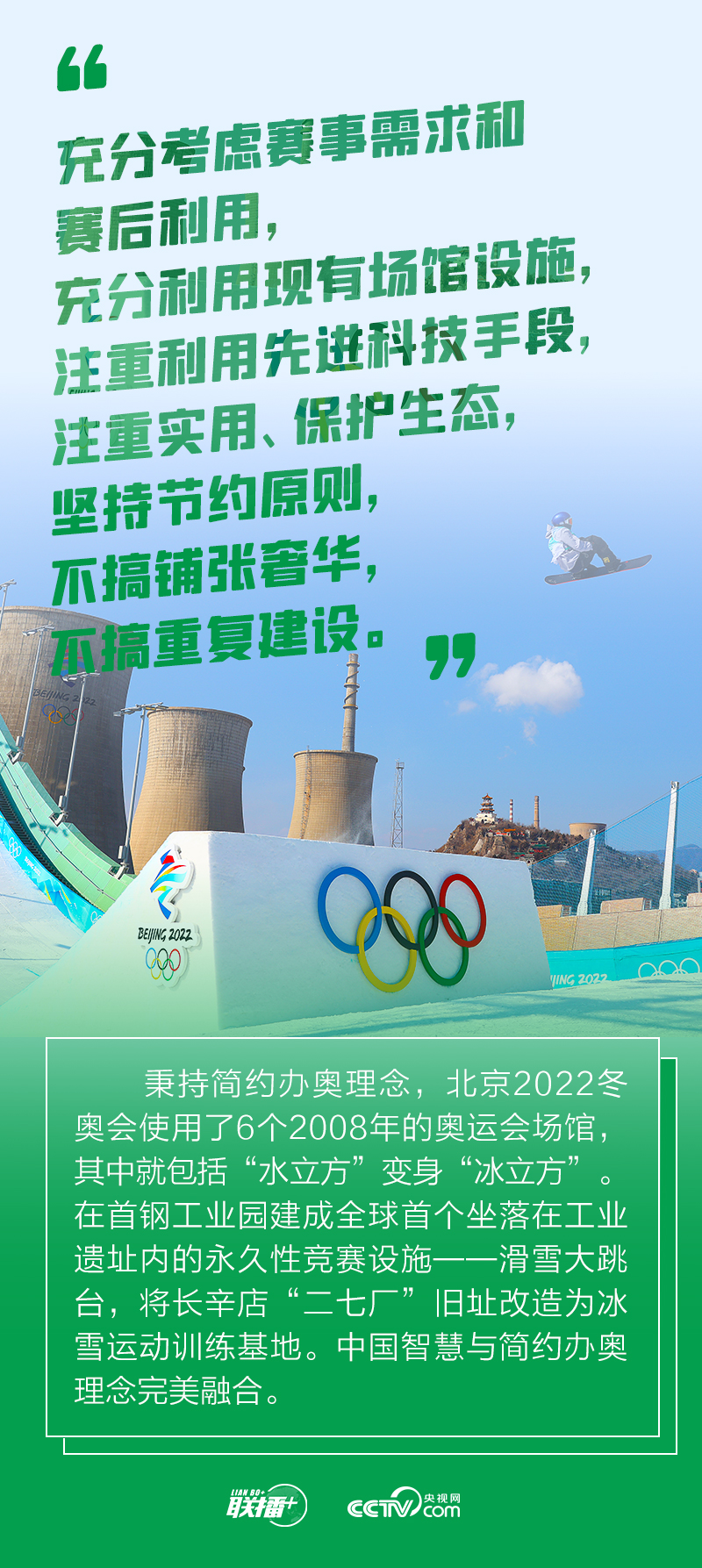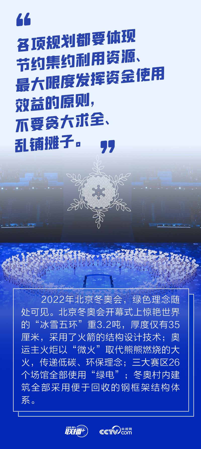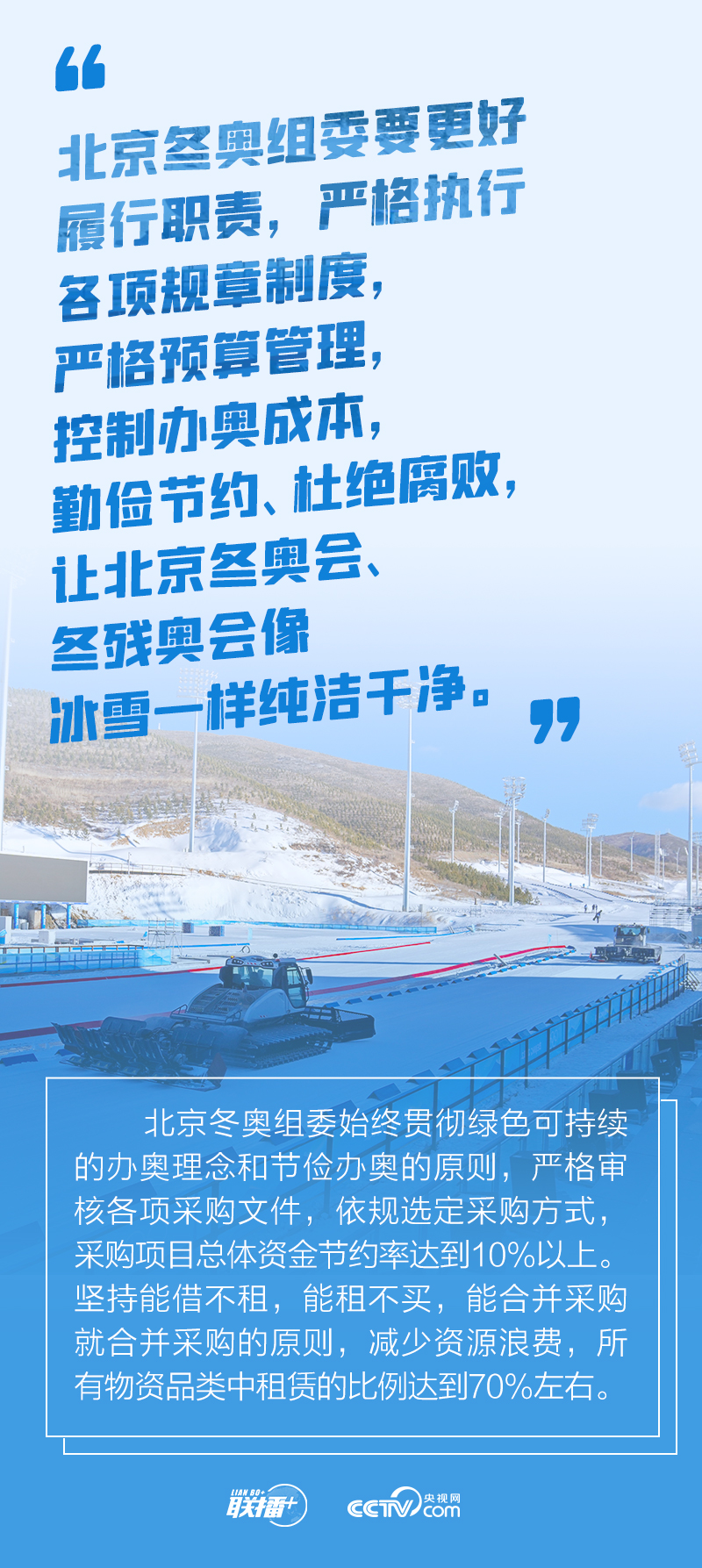 冬奧會籌辦過程中,總書記始終嚴(yán)格要求把勤儉節(jié)約作為“廉潔辦奧”的重要內(nèi)容。2021年1月20日召開的會議進(jìn)一步提出要做好簡化辦賽工作,從實際出發(fā),精簡非必要環(huán)節(jié)、活動和人員數(shù)量。