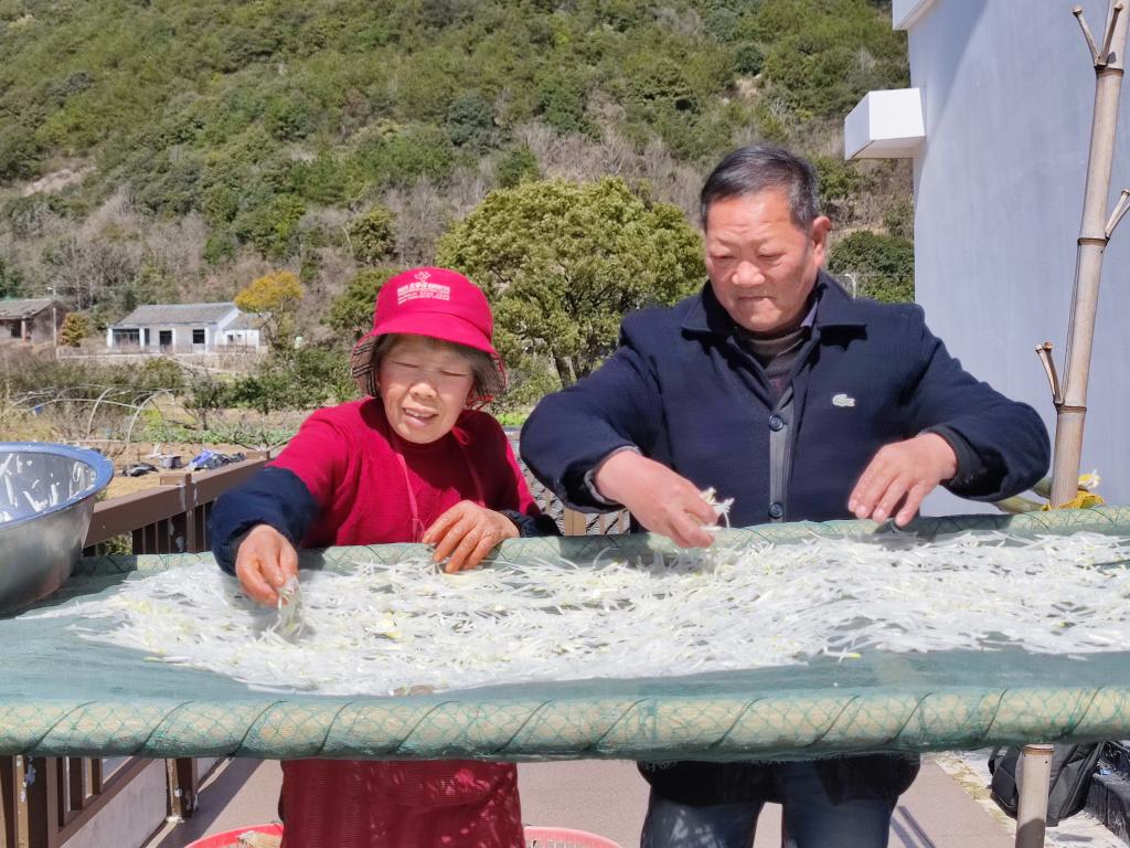 3月9日,袁其忠(右)和老伴在家曬蘿卜干。新華社記者 林光耀 攝