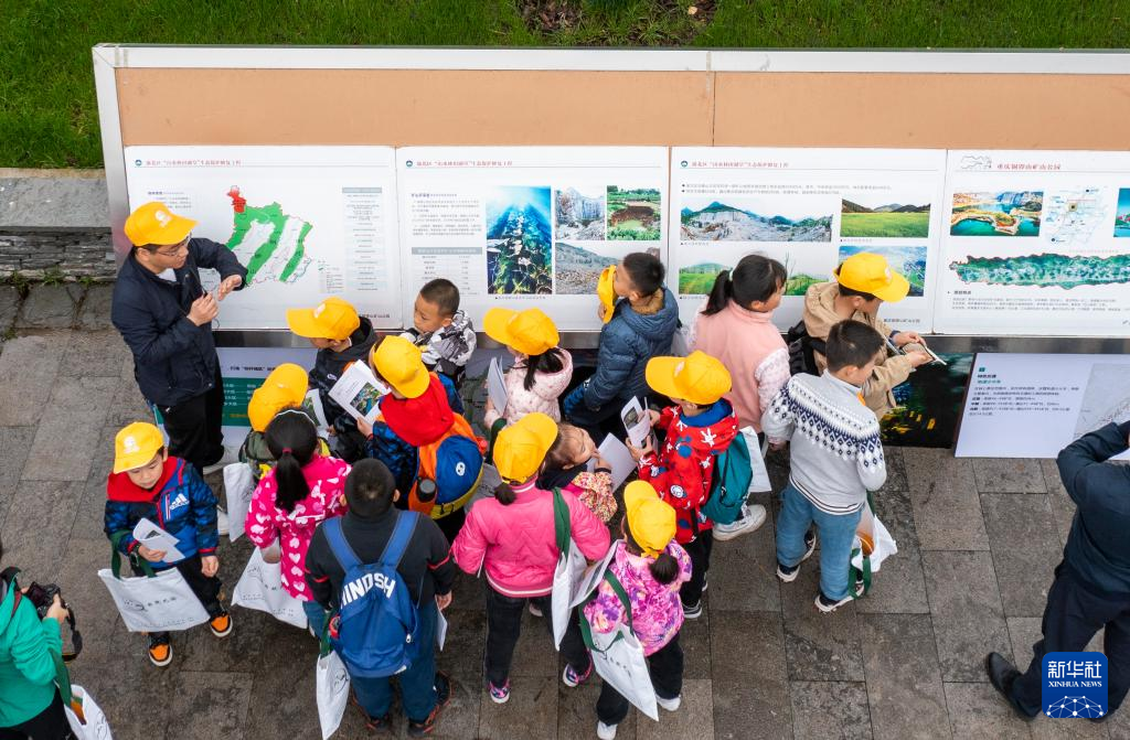 4月17日,參加活動的中小學生在地質(zhì)專業(yè)工作人員的帶領(lǐng)下,對銅鑼山礦山公園的地質(zhì)遺跡和生態(tài)修復(fù)進行科學考察(無人機照片)。