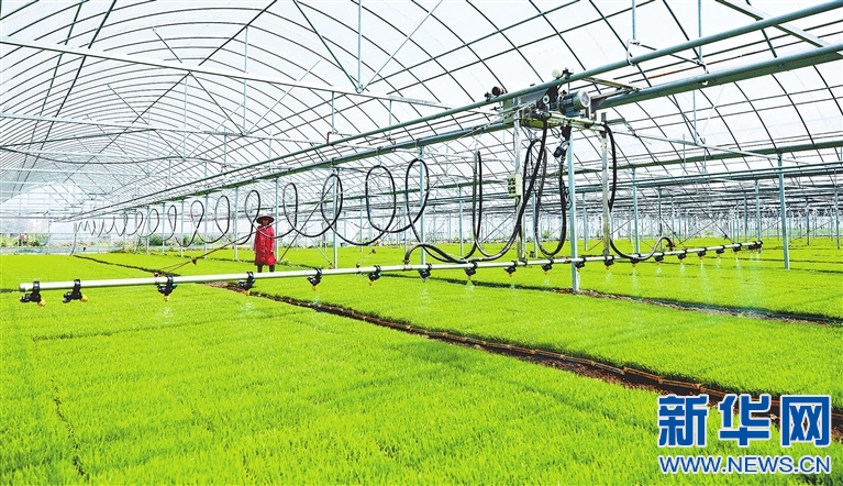 在江西省新余市渝水區(qū)新宋村的育秧大棚內(nèi),一臺(tái)自動(dòng)化噴灌機(jī)沿著軌道勻速給秧苗灌溉。新華網(wǎng)發(fā) 張翰林 攝