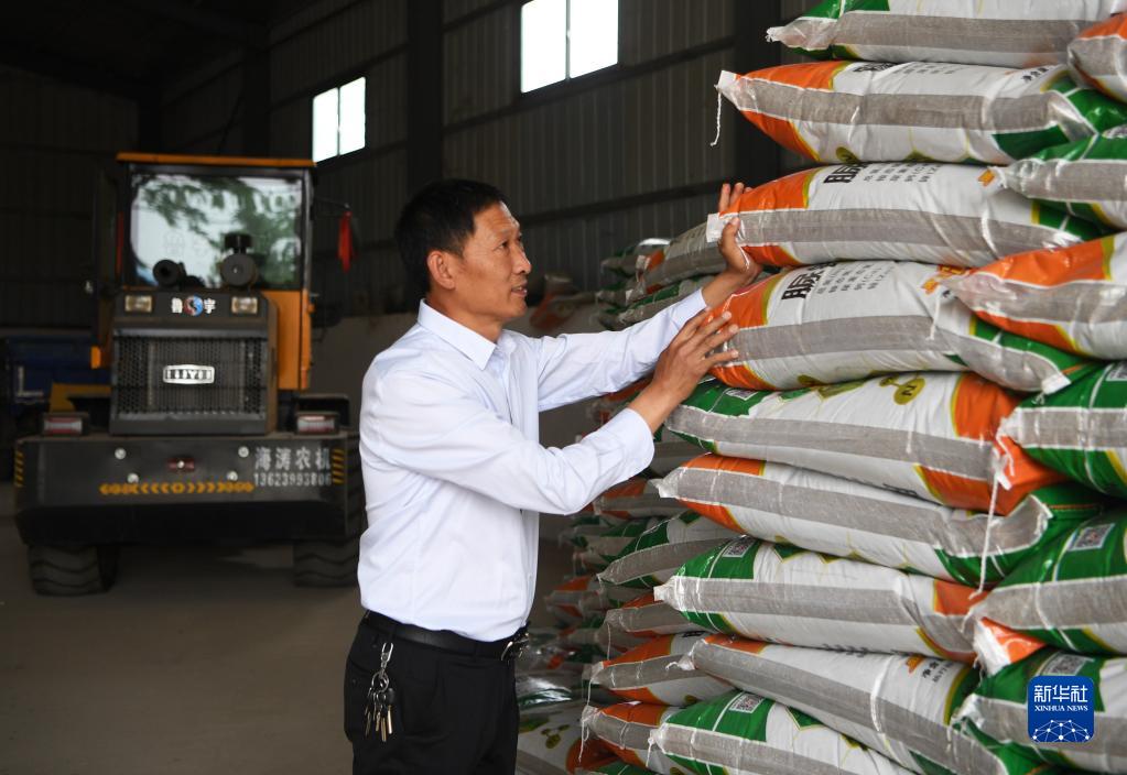 5月26日,在河南省南陽(yáng)市唐河縣湖陽(yáng)鎮(zhèn)張灣村,種糧大戶趙建成在整理倉(cāng)庫(kù)里的化肥,準(zhǔn)備夏收之后的夏種。新華社記者 張浩然 攝