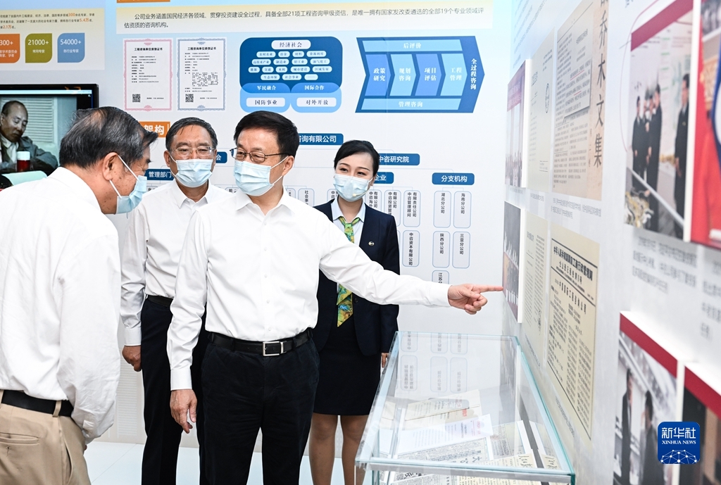 會(huì)前,韓正前往展廳,聽(tīng)取中國(guó)國(guó)際工程咨詢有限公司的發(fā)展歷程介紹,了解公司承擔(dān)基礎(chǔ)設(shè)施、重大工程等重點(diǎn)領(lǐng)域咨詢?nèi)蝿?wù)以及高端智庫(kù)建設(shè)等情況。