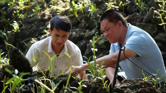 施茶村黨委書記洪義乾(右)查看火山石斛長(zhǎng)勢(shì)。受訪者供圖