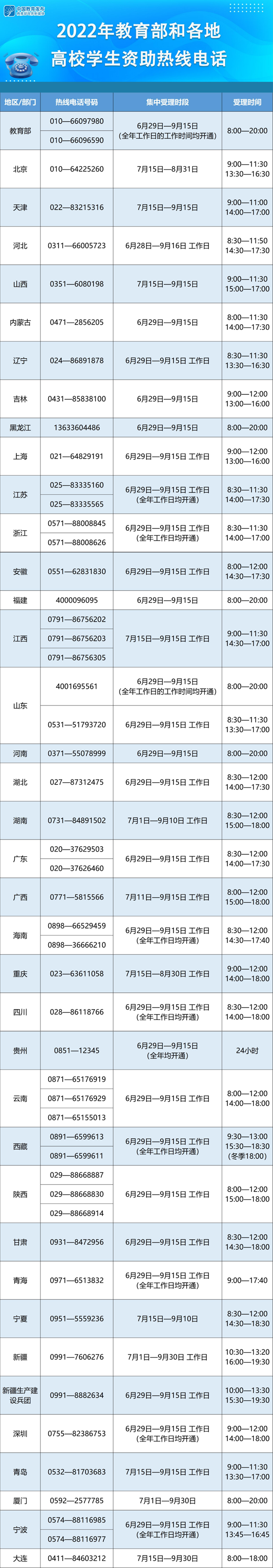 教育部要求各省(區(qū)、市)及所屬高校、中央高校學(xué)生資助管理部門均開通熱線電話,并結(jié)合實(shí)際情況自行確定集中受理時(shí)段和具體受理時(shí)間。