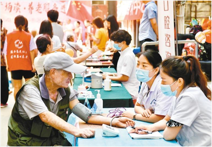 在蓮湖區(qū)安定坊小區(qū)的養(yǎng)老早市上,志愿者為老人提供義診服務(wù)。 (記者 王旭東 攝 資料圖片)