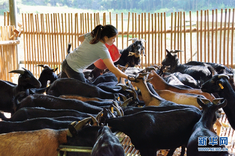 農(nóng)戶正在給黑山羊投放飼料。新華網(wǎng)發(fā) 趙志岸 攝
