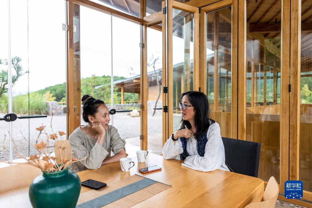 8月31日,林登的妻子瑾妮(右)向當(dāng)?shù)匚璧讣叶^蘭學(xué)習(xí)白族話。新華社記者 曹夢(mèng)瑤 攝
