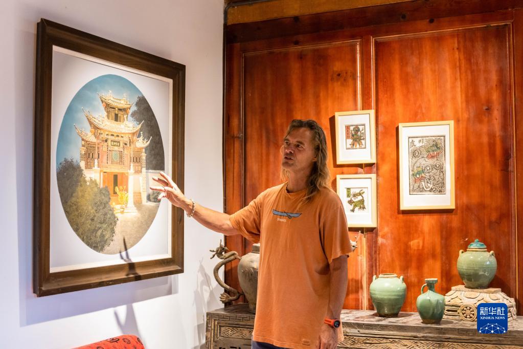 8月30日,林登在沙溪鎮(zhèn)石龍村村史館介紹當(dāng)?shù)厮囆g(shù)家的作品。新華社記者 曹夢(mèng)瑤 攝