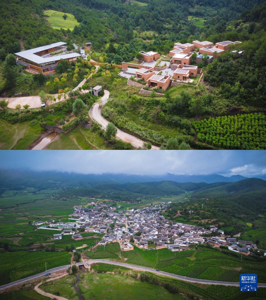 拼版照片:上圖為位于云南省沙溪鎮(zhèn)石龍村的喜林苑沙溪店(8月31日攝,無人機(jī)照片);下圖為喜林苑沙溪店所在的石龍村(8月31日攝,無人機(jī)照片)。新華社記者 曹夢(mèng)瑤 攝