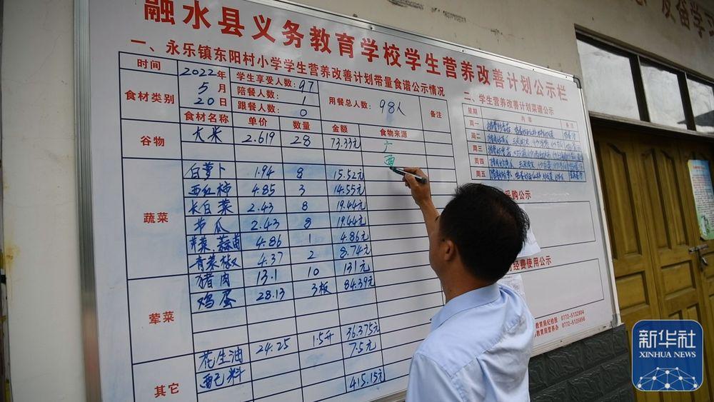 5月20日,在廣西融水苗族自治縣東陽(yáng)村小學(xué)食堂,校長(zhǎng)藍(lán)正立在告示牌上寫菜譜。新華社記者 張愛(ài)林 攝
