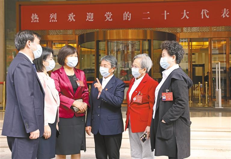 十月十四日,出席黨的二十大的陜西代表王友民、何菲、常亞瓊、張蓮蓮、路生梅、王照輝(左起)在住地交流履職感想。代表們一致表示,將堅決扛起政治責(zé)任,以飽滿的熱情認(rèn)真履行好神圣職責(zé)。 記者 母家亮攝
