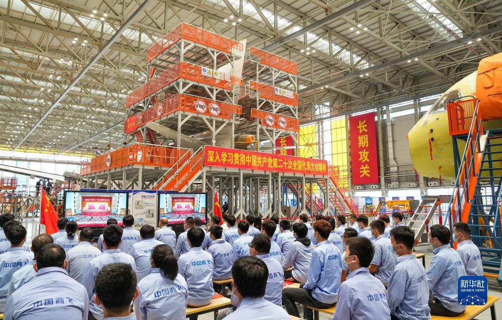 10月16日,在中國商飛上海飛機(jī)制造有限公司總裝車間,員工們在收看中國共產(chǎn)黨第二十次全國代表大會開幕會。新華社記者 丁汀 攝