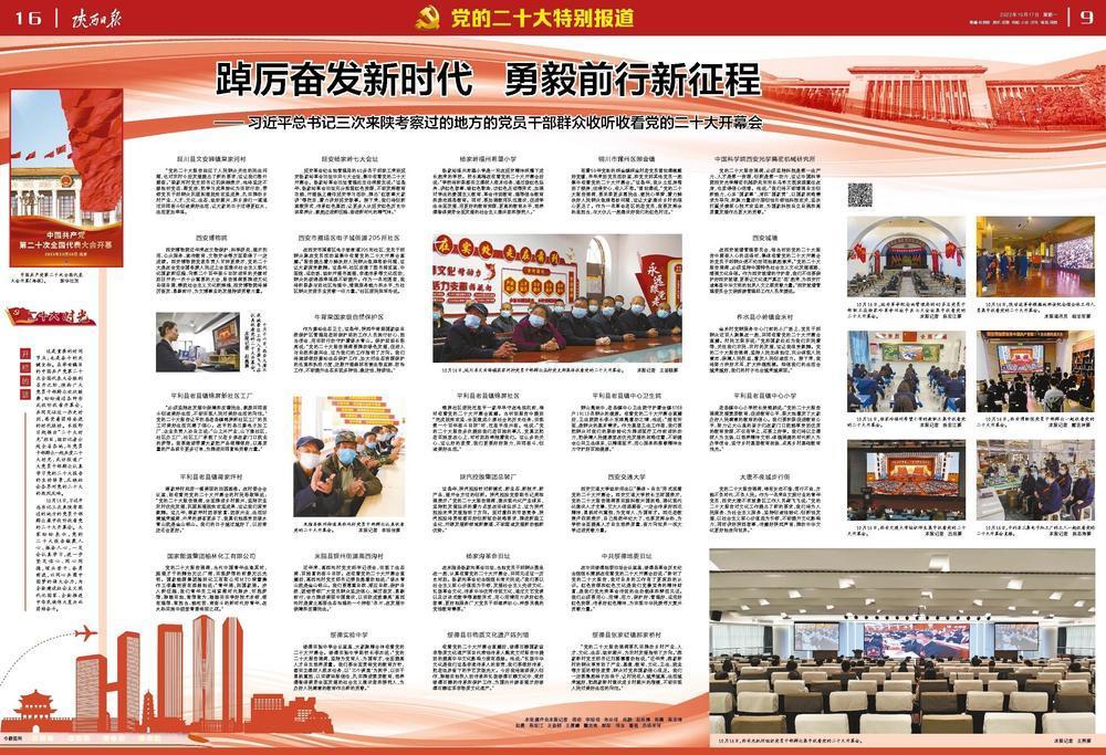 這是重要的時間節(jié)點,也是奮斗的關(guān)鍵坐標(biāo)。在舉世矚目的中國共產(chǎn)黨第二十次全國代表大會勝利召開之際,陜西廣大黨員干部群眾歡欣鼓舞,紛紛通過各種形式收聽收看開幕會,共同見證這一歷史時刻,感受著團結(jié)奮進的時代脈動。本報即日起推出“二十大時光”欄目,組織記者分赴全省各地,與黨員干部群眾一起共度二十大時光,采訪報道廣大黨員干部群眾認(rèn)真學(xué)習(xí)黨的二十大報告的生動場景,反映社會各界對黨的二十大的熱烈反響。