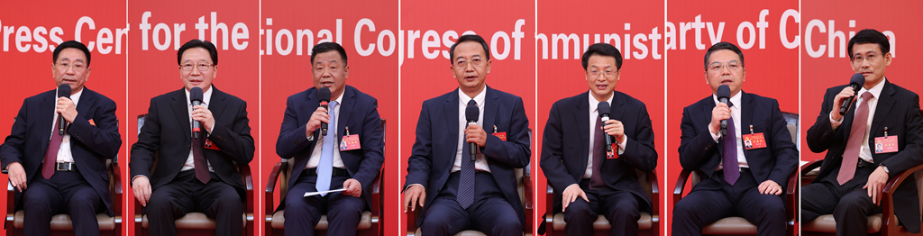 10月19日,中國共產(chǎn)黨第二十次全國代表大會新聞中心舉行集體采訪。山東、河南、湖北、湖南、廣東、廣西、海南代表團新聞發(fā)言人出席,介紹代表團學習討論二十大報告情況,并回答記者提問(拼版照片)。新華社記者 張玉薇 攝