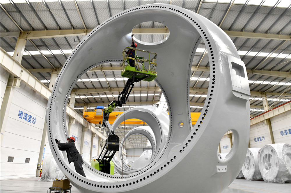 在山東省惠民縣風電裝備產(chǎn)業(yè)基地涂裝車間,工作人員對風電輪轂進行涂裝(2022年6月7日攝)。新華社記者 郭緒雷 攝