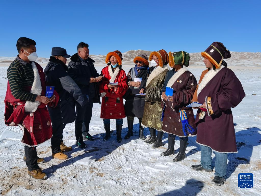 2021年12月20日,瑪多縣人民法院院長(zhǎng)錢快乾(左一)給當(dāng)?shù)啬羺^(qū)群眾宣講法律知識(shí)。新華社發(fā)