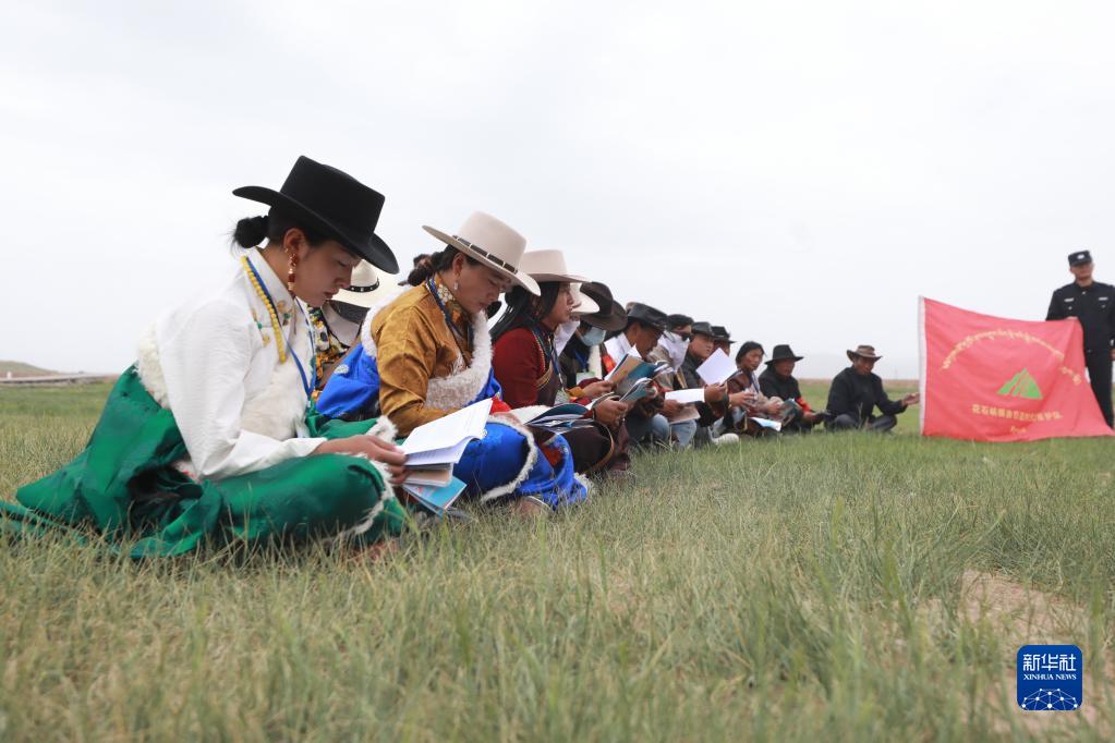 2022年7月12日,在瑪多縣花石峽鎮(zhèn)吉日邁村,瑪多縣人民法院立案庭庭長(zhǎng)才偵措(中)在開展環(huán)境保護(hù)相關(guān)法律宣傳。新華社發(fā)