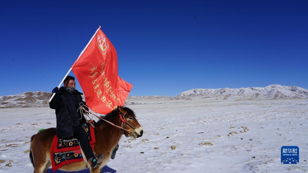 2021年12月20日,瑪多縣人民法院院長(zhǎng)錢快乾騎著馬,擎著“瑪多法院巡回法庭”的旗子,下鄉(xiāng)進(jìn)行普法宣傳。新華社發(fā)