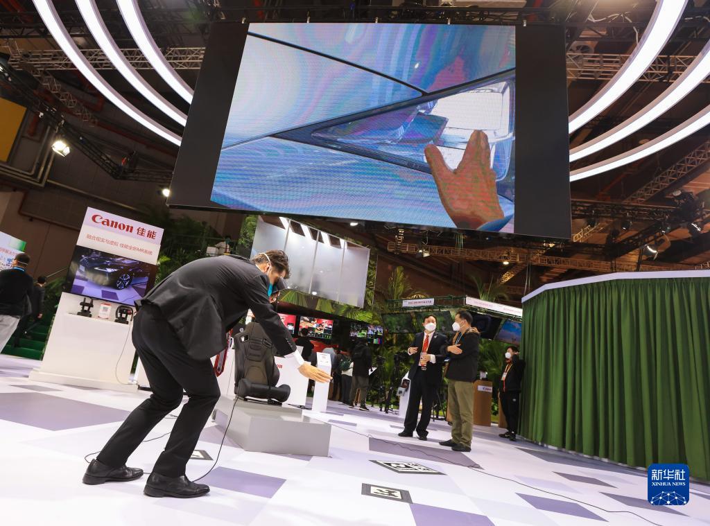11月7日,展商在第五屆進(jìn)博會(huì)佳能展臺(tái)演示MR虛擬現(xiàn)實(shí)系統(tǒng)。新華社記者 李京 攝