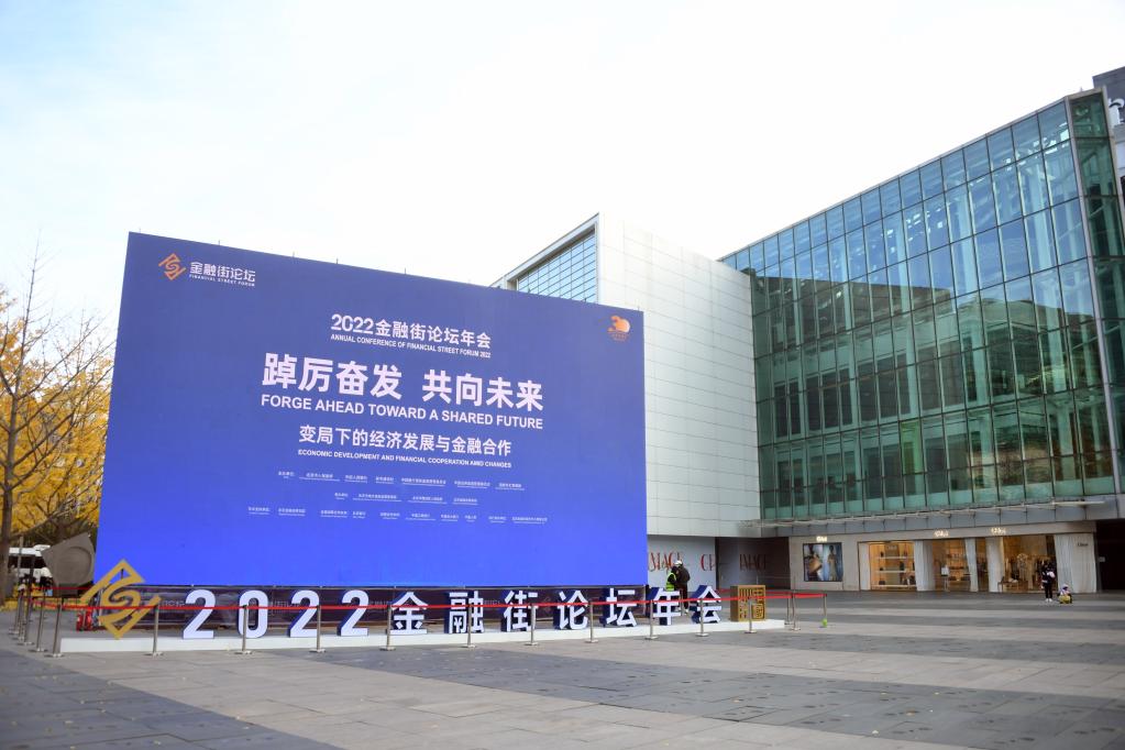 11月21日在北京金融大街附近拍攝的2022金融街論壇年會(huì)標(biāo)識(shí)。新華社記者 任超 攝