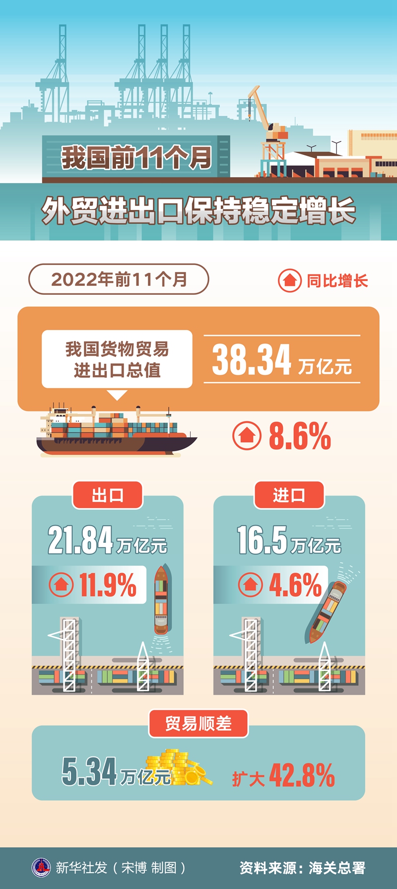 海關(guān)總署7日發(fā)布數(shù)據(jù):今年前11個(gè)月,我國(guó)貨物貿(mào)易進(jìn)出口總值38.34萬億元,同比增長(zhǎng)8.6%。其中,出口21.84萬億元,增長(zhǎng)11.9%;進(jìn)口16.5萬億元,增長(zhǎng)4.6%;貿(mào)易順差5.34萬億元,擴(kuò)大42.8%。