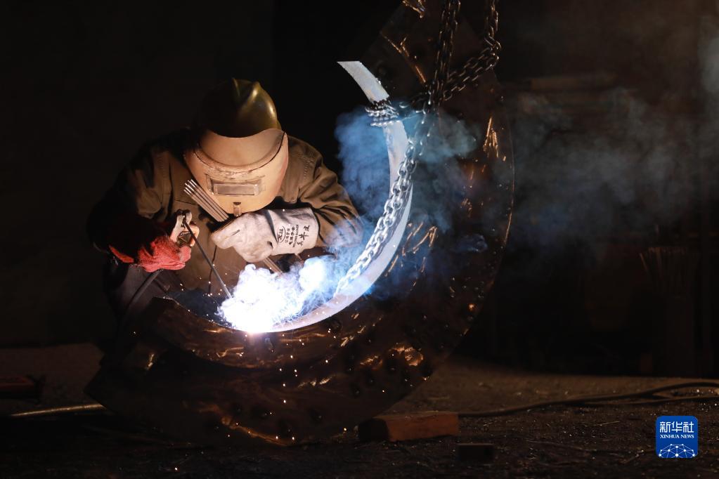 1月10日,在浙江省杭州市臨安區(qū)天目山鎮(zhèn)一家制造廠內(nèi),工人進行焊接作業(yè)。新華社發(fā)(胡劍歡 攝)