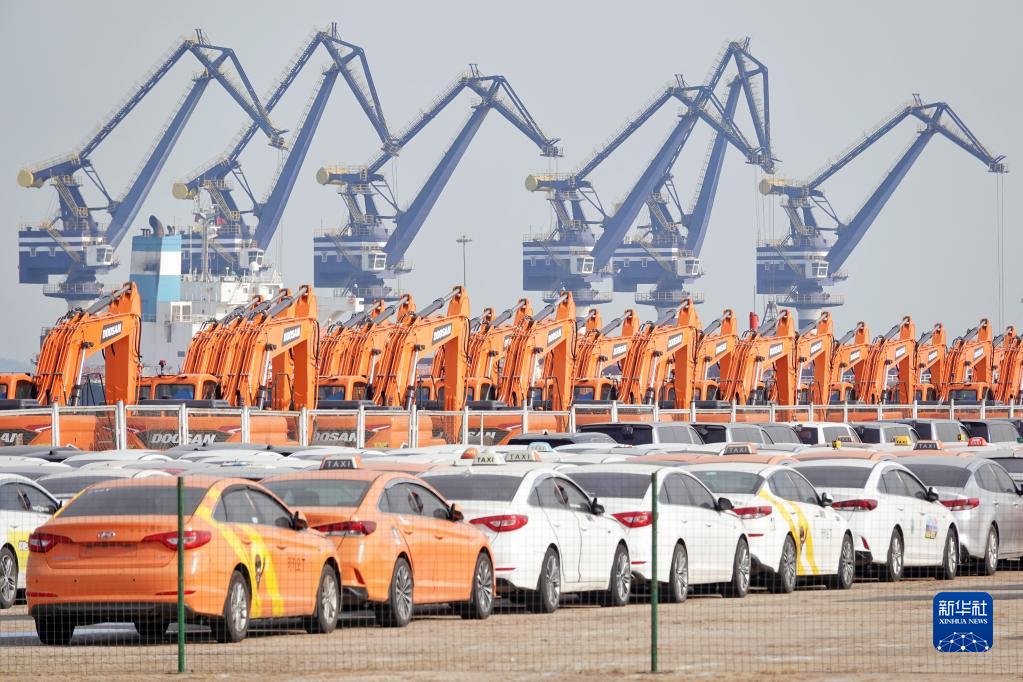 1月17日,在山東港口煙臺港,起重機為貨輪裝卸貨物。新華社發(fā)(唐克 攝)