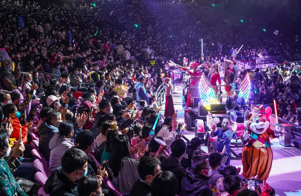 游客在廣州長隆旅游度假區(qū)游園看馬戲迎接新年。新華社記者 劉大偉 攝