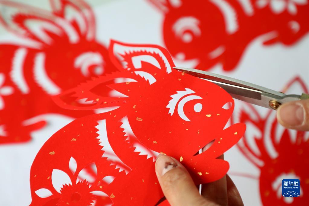 山東省濱州市惠民縣李莊鎮(zhèn)民間藝人在創(chuàng)作生肖兔剪紙作品(1月13日攝)。新華社發(fā)(初寶瑞 攝)