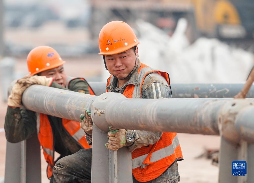 工人在重慶兩江新區(qū)新能源汽車(chē)產(chǎn)業(yè)園基礎(chǔ)設(shè)施配套項(xiàng)目現(xiàn)場(chǎng)進(jìn)行鋼結(jié)構(gòu)材料拼裝作業(yè)(1月23日攝)。新華社記者 劉潺 攝