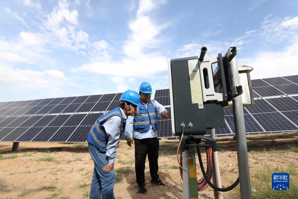 國家電投五凌電力余丁光伏電站職工在檢修設(shè)備(2022年8月31日攝)。新華社記者 盧鷹 攝