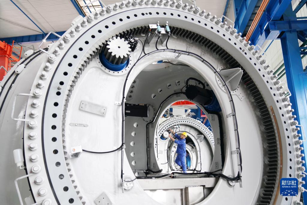 在黑龍江省齊齊哈爾市中國一重集團(tuán)有限公司風(fēng)電裝備生產(chǎn)制造廠生產(chǎn)車間,工人進(jìn)行生產(chǎn)作業(yè)(2021年7月1日攝)。新華社記者 王建威 攝