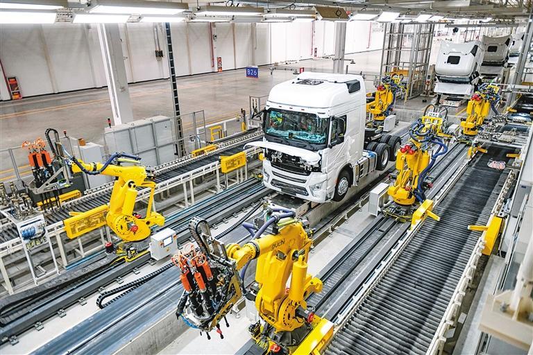 陜汽重卡擴(kuò)能項(xiàng)目總裝生產(chǎn)線,工業(yè)機(jī)器人正在進(jìn)行自動化裝配作業(yè)。(資料照片) 記者 竇翊明 攝
