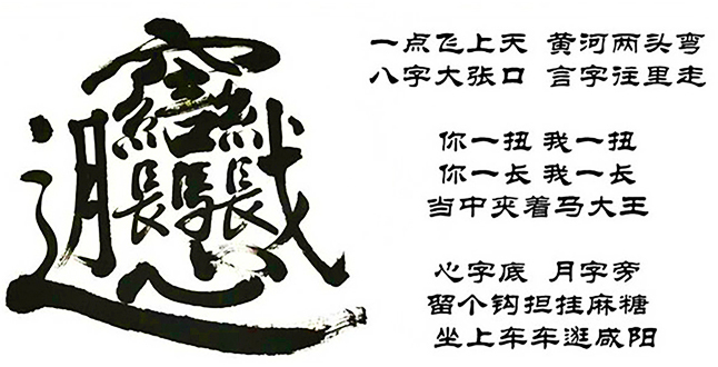 可“biang”字怎么寫?秀才拿出筆墨,寫出了以下口訣:一點飛上天,黃河兩邊彎;八字大張口,言字往里走,左一扭,右一扭;西一長,東一長,中間加個馬大王;心字底,月字旁,留個勾搭掛麻糖;推個車車逛咸陽。于是就有了今天的“biang”字。