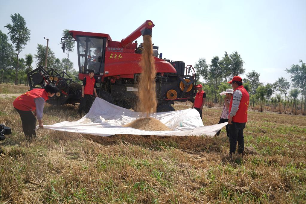 在河北邢臺(tái)經(jīng)濟(jì)開發(fā)區(qū)的一處麥田,志愿者正在幫助農(nóng)民收小麥。新華社記者 鄒尚伯 攝