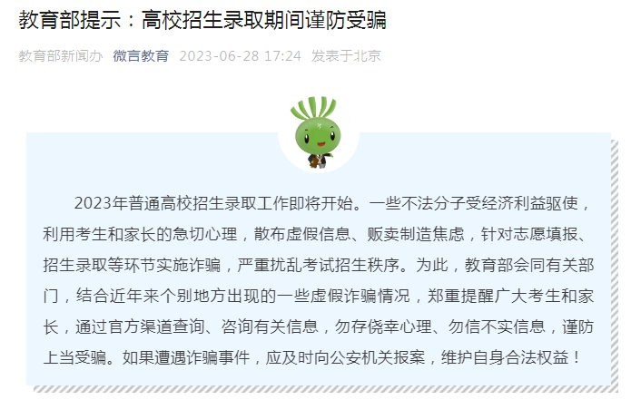 教育部還提醒,要提高防范意識(shí),妥善保管好自己的身份證號(hào)、考生號(hào)等個(gè)人信息和志愿填報(bào)系統(tǒng)密碼等登錄信息,不要泄露給他人,防止志愿被他人篡改。(記者王鵬)