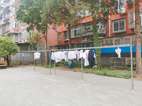 走出古城南路社區(qū)東門,沿古城東街北行400余米右轉(zhuǎn)進(jìn)入八角北路社區(qū),只見幾株高大的國槐及道邊的綠藤錯(cuò)落有致。再向里走,是一塊寬闊的活動(dòng)場地,北側(cè)建有一排不銹鋼晾衣架,架上晾滿了衣服。“有居民提出家里陽臺(tái)上晾衣服不方便,我們特地尋找合適地方,為這些社區(qū)建了晾衣架。”北京石房物業(yè)有限公司(以下簡稱石房物業(yè))副經(jīng)理孫偉說。