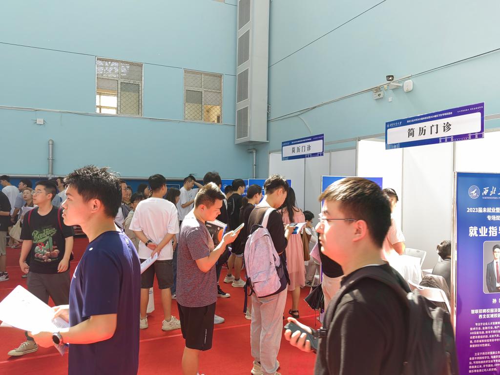 西北工業(yè)大學(xué)舉辦的招聘會(huì)上,學(xué)生在簡(jiǎn)歷門診咨詢。