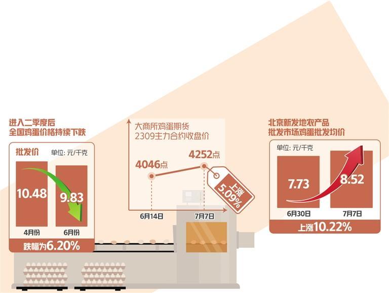 7月7日,大商所雞蛋期貨2309主力合約以4252點報收,比6月14日收盤4046點上漲5.09%。一些地方雞蛋現(xiàn)貨價格也顯著反彈。7日,北京新發(fā)地農(nóng)產(chǎn)品批發(fā)市場雞蛋批發(fā)均價為8.52元/千克,比上周同期(6月30日)的7.73元/千克上漲10.22%。“本周蛋價快速反彈不具有可持續(xù)性,僅是正常波動。當前雞蛋供應仍然充足,沒有出現(xiàn)供不應求的狀況。”北京新發(fā)地農(nóng)產(chǎn)品批發(fā)市場統(tǒng)計部經(jīng)理劉通介紹。