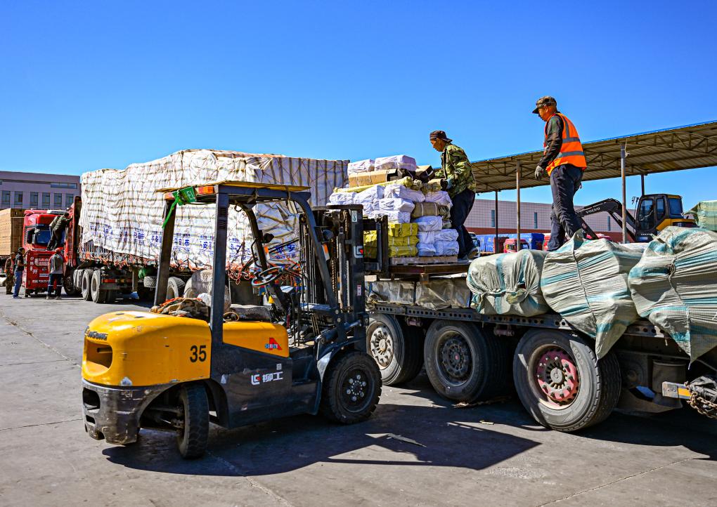 2023年6月11日,工人在二連浩特口岸旁的進出口物流園區(qū)中裝載準備出口的貨物。新華社記者 彭源 攝