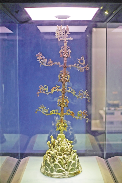 其中出土的東漢綠釉紅陶扶桑,俗稱“搖錢樹”。“搖錢樹”是我國(guó)西南地區(qū)的一種特殊陪葬品。“傳說搖動(dòng)樹干,就會(huì)源源不斷地掉下錢幣,在老百姓心中,它就是財(cái)富的象征。”秦佳穎說。