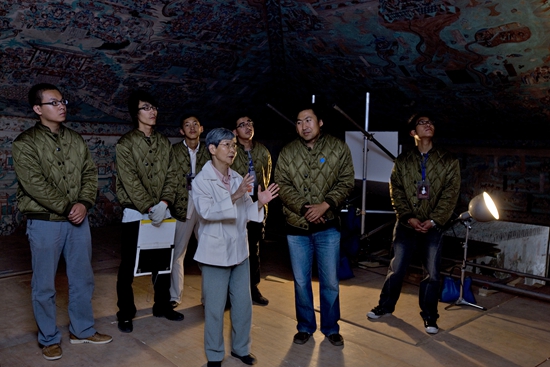 樊錦詩在莫高窟第85窟壁畫修復現(xiàn)場檢查工作。