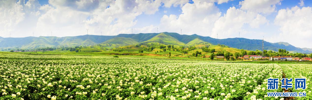 八月,青山環(huán)抱的黃土坡上,土豆花成團(tuán)成簇盛開,連成一片花海。
