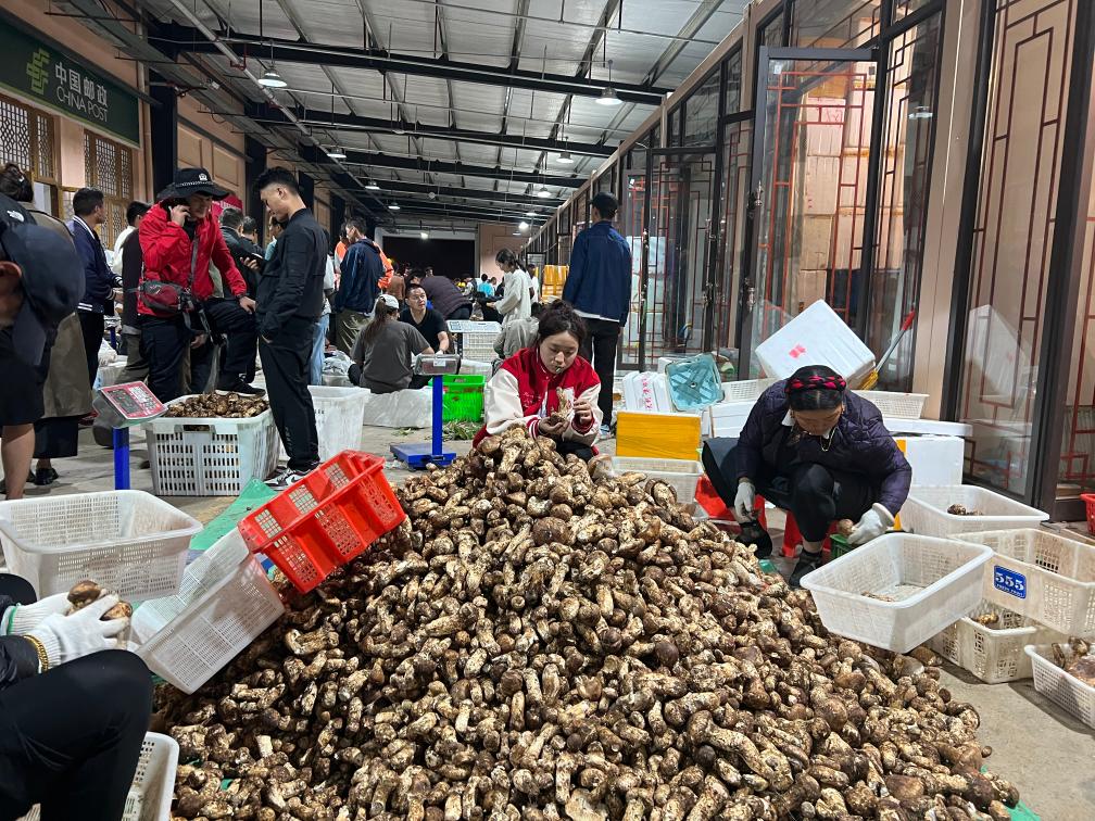 晚上11時,記者走進(jìn)當(dāng)?shù)厮扇捉灰资袌?,看到客商云集,門店前滿是用松茸堆成的小山。雖已入夜,市場內(nèi)人聲鼎沸,商戶達(dá)瓦央宗熱情地拉住記者,推銷自家采摘的松茸。詢問得知,這段時間,她和家人每天凌晨3點(diǎn)半摸黑出門,沿著山道來到家附近的青杠林采摘新鮮松茸,然后來市場交易,有時一忙就要持續(xù)到深夜。“一個松茸季下來,家里能增加五六萬元的收入。”